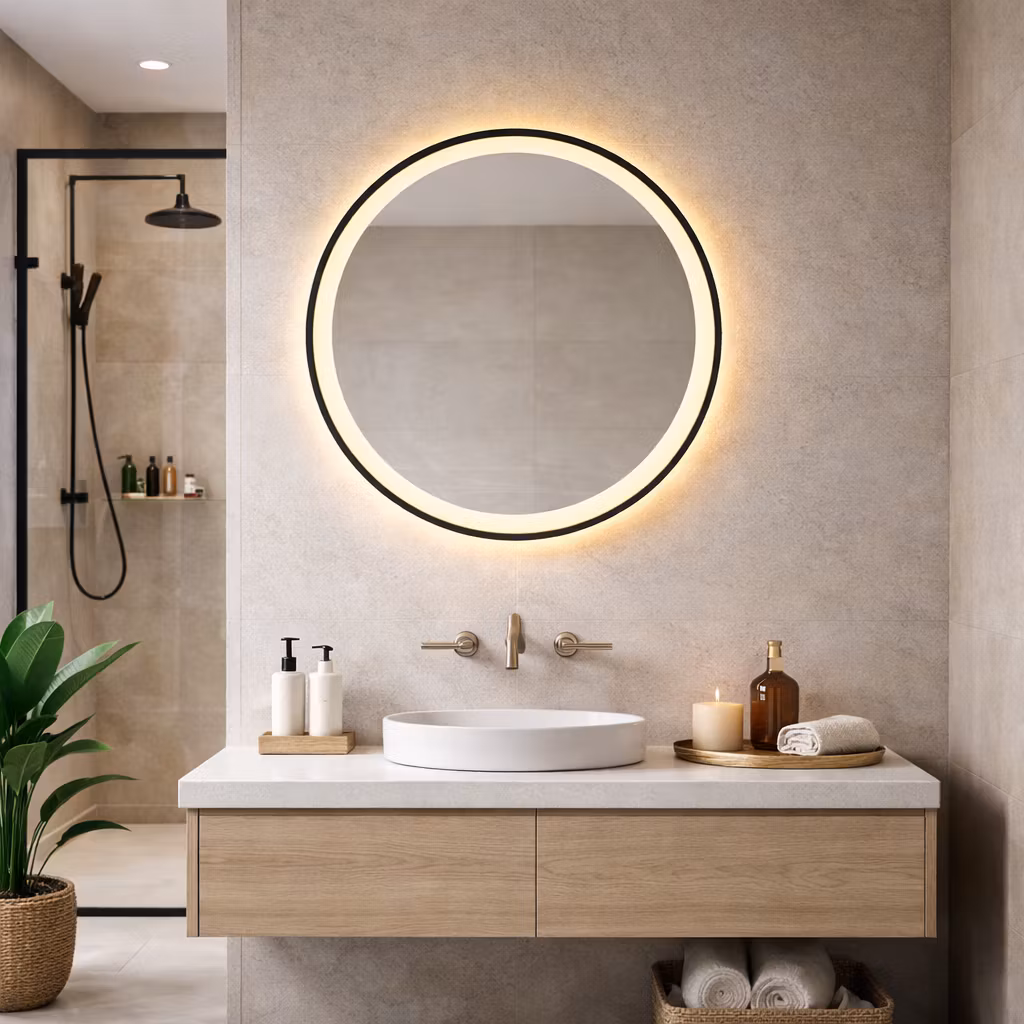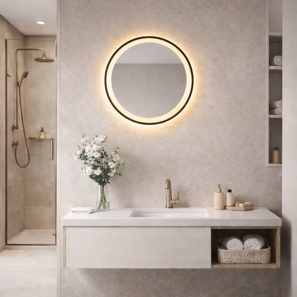 Denna runda, upplysta spegel har en diameter på 60 cm och är tillverkad av kopparfritt glas. Den svarta ramen är utrustad med dimbar 3CCT LED-teknik (2700K/4000K/6500K), vilket gör att du kan justera färgtemperaturen efter behov – från varmt till kallt ljus.