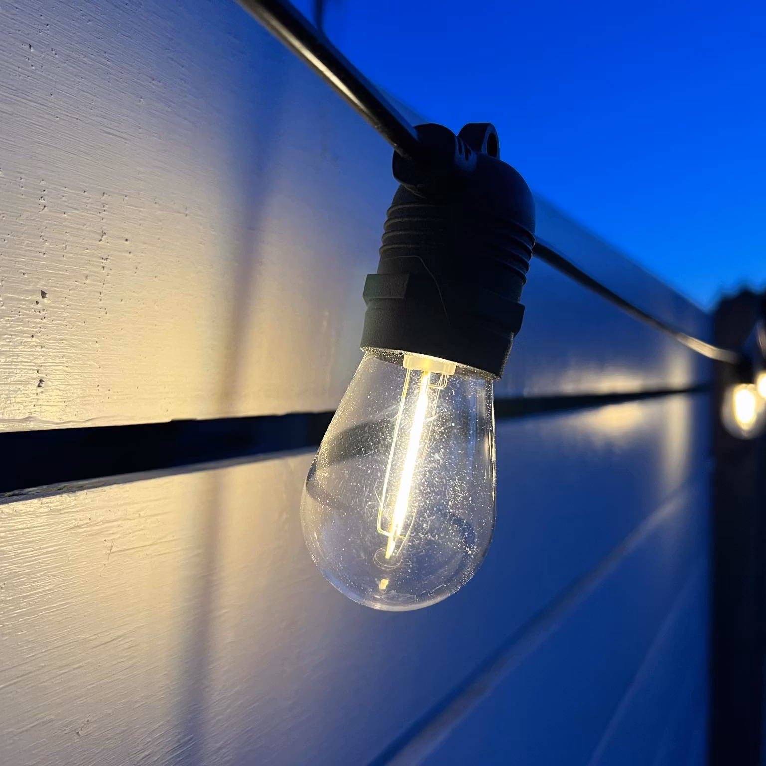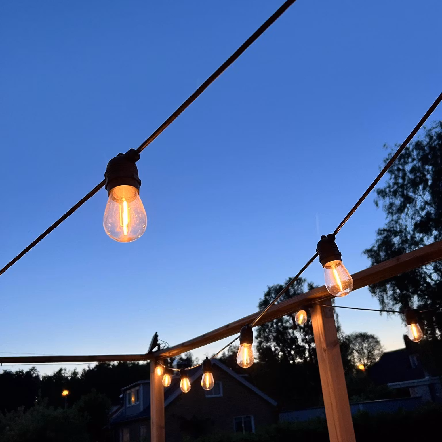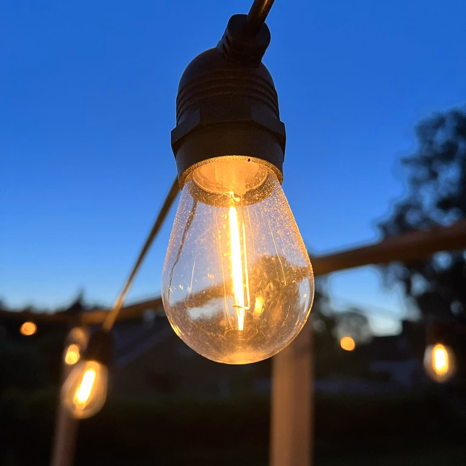 La catena viene fornita con lampadine LED E27 sostituibili con temperatura colore calda 2200K (piacevole effetto “luce da lampadina a incandescenza”). Se una lampadina si rompe, sostituisci solo la lampadina – non tutta la catena.